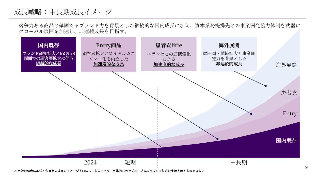 さらに、医療従事者以外の患者が着る患者衣や検査着という領域を加え、これらを世界各国で展開することで、非連続的な成長を目指すことが、当社の中長期的な成長イメージ・戦略です。