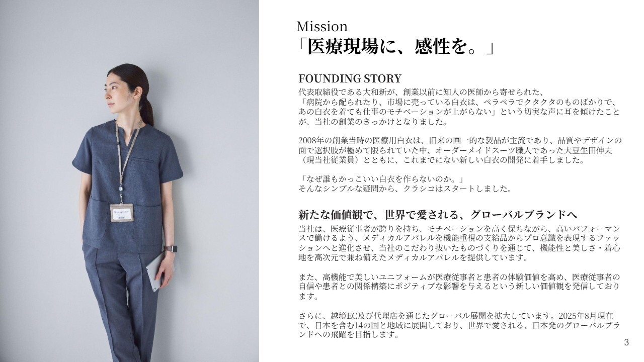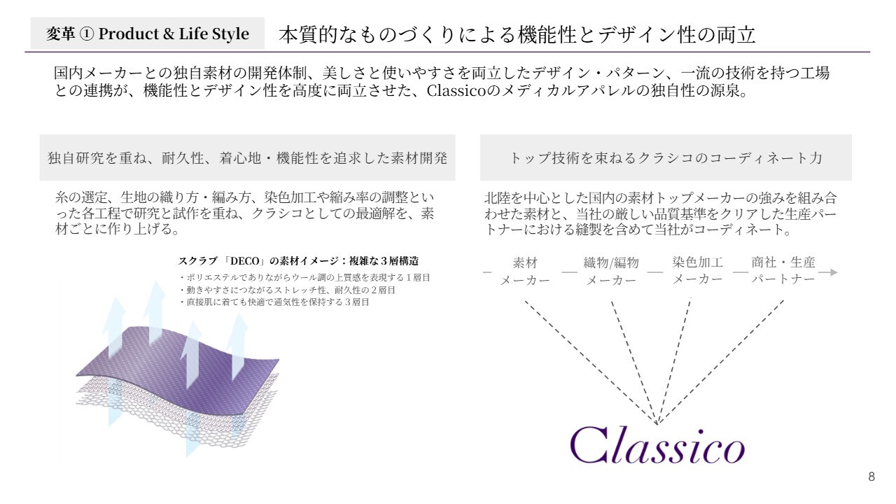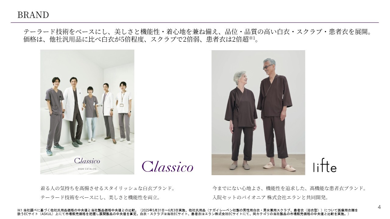 スライドに掲載しているものは、当社のフラッグシップブランドの2つです。どちらも、美しさ、機能性、着心地を兼ね備えた、高品位・高品質の白衣、スクラブ、患者衣を提供するブランドです。スライド左側は、医療従事者向けの「Classico」というブランドです。