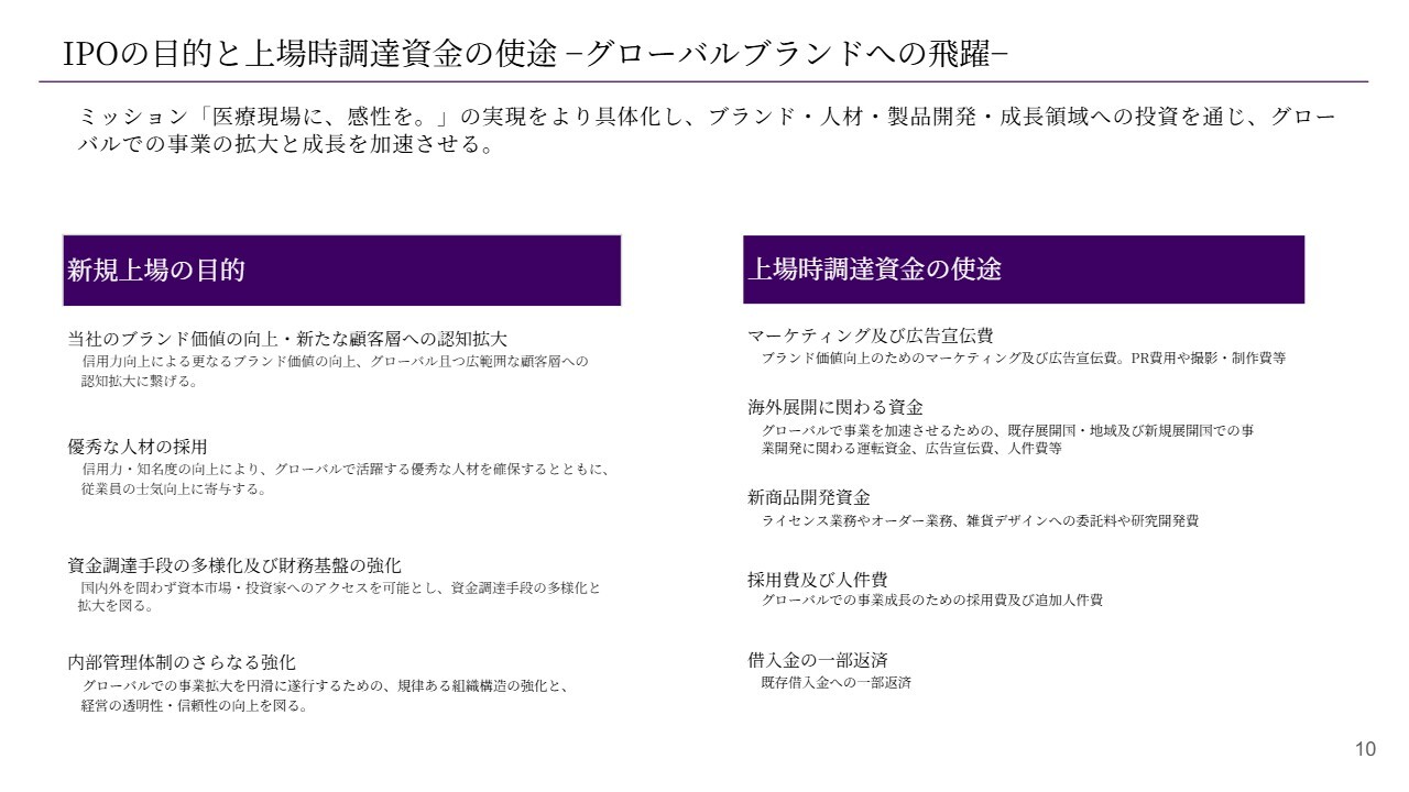 今回のIPOの目的についてご説明します。当社は、「医療現場に、感性を。」というミッションを実現するために活動しています。その中で、グローバルブランドを構築し、ブランド価値を向上させていくことを目指しています。