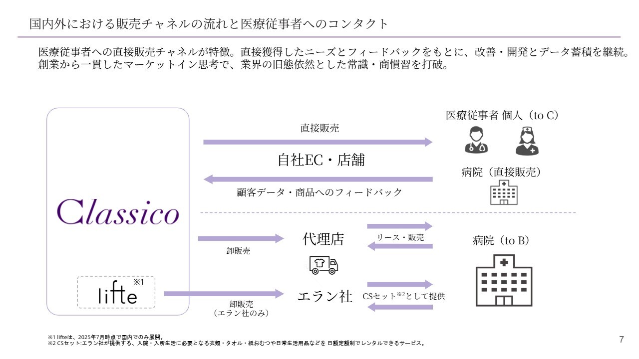 当社の最大の特徴は、スライドの上段に記載されているように、医療従事者個人(ドクター・ナース)と直接つながり、自社ECや店舗を介してその声を聞きながら商品開発を行い、データを蓄積する点です。これによってブランドを構築しています。