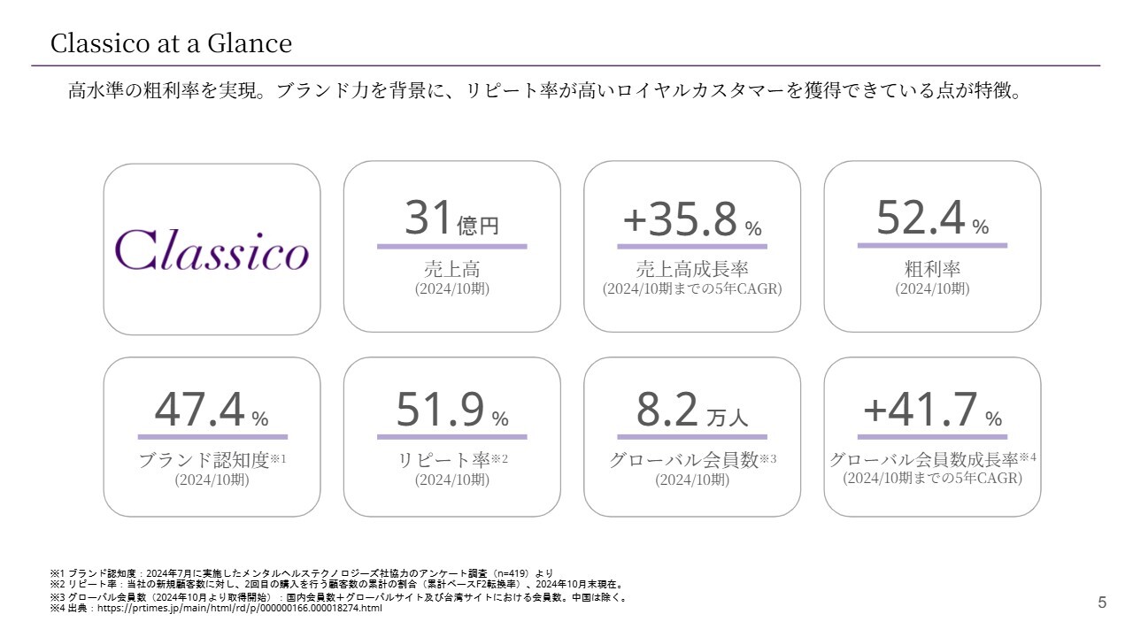特に注目していただきたいのは、スライド上段の右上にある粗利率で、52.4パーセントとなっています。一般的なアパレルと比較しても、非常に高い粗利率水準を誇っていることが当社の特徴です。