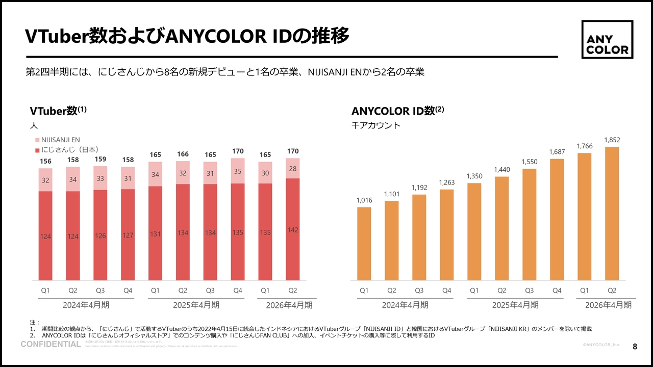 VTuber数およびANYCOLOR ID数の推移です。VTuber数では、第2四半期に「にじさんじ」から8名が新規デビューし、1名が卒業しました。また、「NIJISANJI EN」から2名が卒業しています。