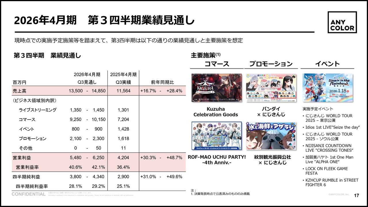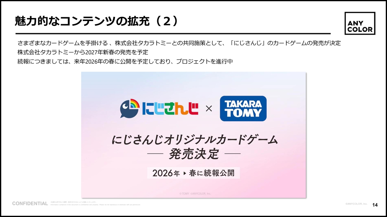 11月に公表したとおり、タカラトミーさまとの共同施策として、「にじさんじ」のカードゲームの発売を決定しました。発売はタカラトミーさまから2027年新春に予定されており、当社はこの販売に伴うロイヤリティ収入を、プロモーション領域にて計上する予定です。