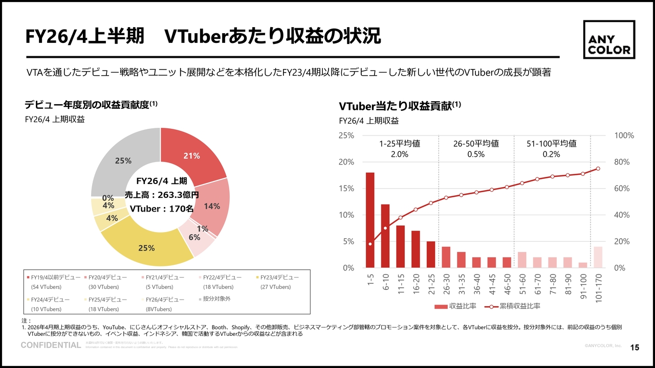 上半期のVTuberあたり収益の状況についてご説明します。この上半期を振り返ると、VTAを通じたデビュー戦略やユニット展開を本格化させた2023年4月期以降にデビューした新しい世代のVTuberが占める割合が大きくなり、この成長が著しいと考えています。