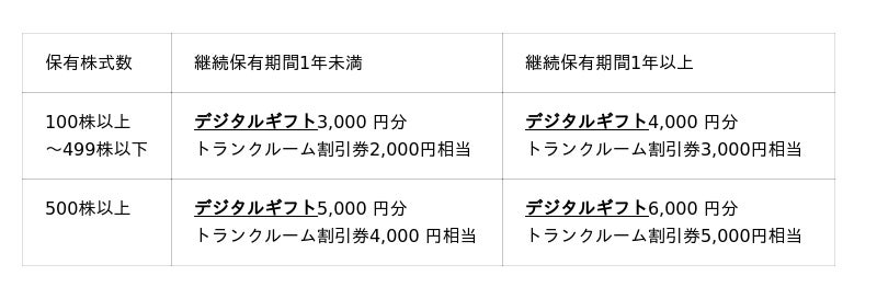 株主の皆さまの利便性向上を目的として、従来の贈呈品である「QUOカード」から複数の品目から選択が可能な「デジタルギフト」へ変更することといたしました。なお、当社トランクルーム割引券贈呈に関しましては変更ございません。