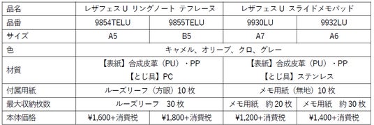 合成皮革製の「レザフェスU」シリーズから、「レザフェスU リングノート テフレーヌ」と「レザフェスU スライドメモパッド」を発売
