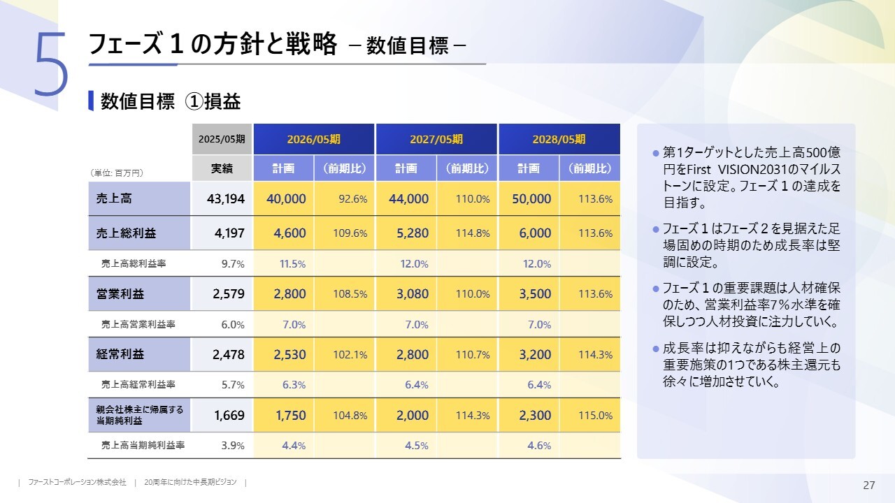 フェーズ1は、フェーズ2に向けた足場固めの期間であり、中長期的な成長に向けた基盤構築を主軸に置いています。当面の目標として、3年目に売上高500億円の達成を目指し、営業利益は35億円、営業利益率は7パーセント程度を想定しています。