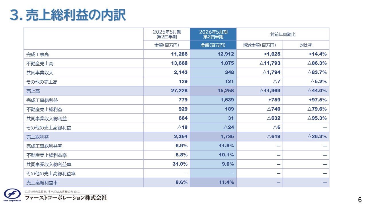売上総利益の内訳です。冒頭でご説明したとおり、完成工事高は前年同期比で増加しましたが、不動産売上高および共同事業収入は減少しました。利益率については、完成工事総利益率が前期の6.9パーセントから今期は11.9パーセントへと大きく回復しています。