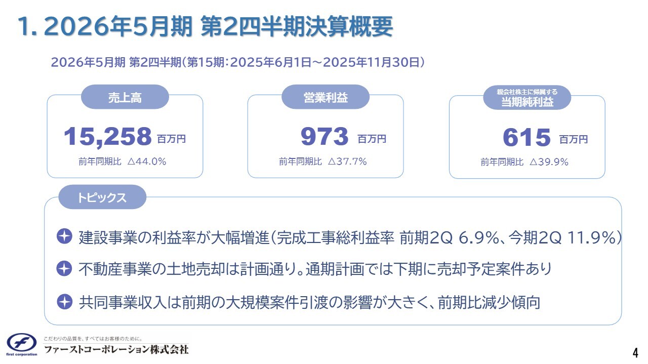 売上高は152億5,800万円、営業利益は9億7,300万円、親会社株主に帰属する当期純利益は6億1,500万円で、いずれも前年同期を下回りました。前期の第1四半期に共同事業で大型の竣工があったこと、そして第2四半期に大口の土地売却があったことが影響し、不動産事業で大きな差異が生じたためです。今期第2四半期の進捗は計画どおりとなっています。