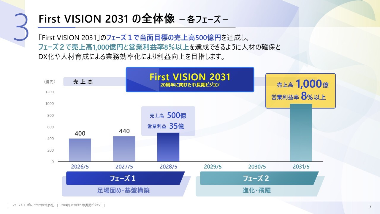 「First VISION 2031」の各フェーズの考え方についてです。フェーズ1では、当面の目標である売上高500億円の達成を目指します。同時に、次のステージである1,000億円企業へと進むための基盤を着実に整備します。