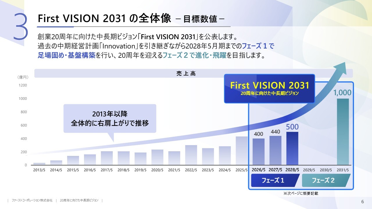 「First VISION 2031」の全体像です。当社の売上高は長期的に右肩上がりで推移してきました。この成長をさらに加速させるため、「First VISION 2031」では2つのフェーズに区分して進めていきます。