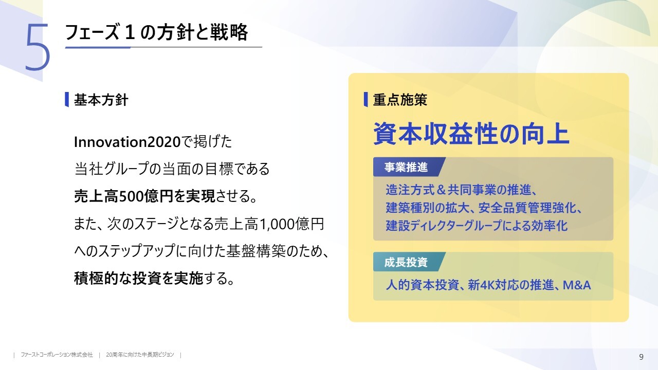 フェーズ1の基本方針は、従来目標の売上高500億円の実現と、次のステージであるフェーズ2での売上高1,000億円へのステップアップに向けた基盤構築への投資です。