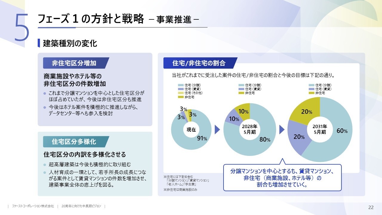 具体的には、スライド右側の円グラフの右端に示しているように、2031年5月期までに分譲マンション以外の住宅やホテルなどを受注し、建設種別の分散を目指します。