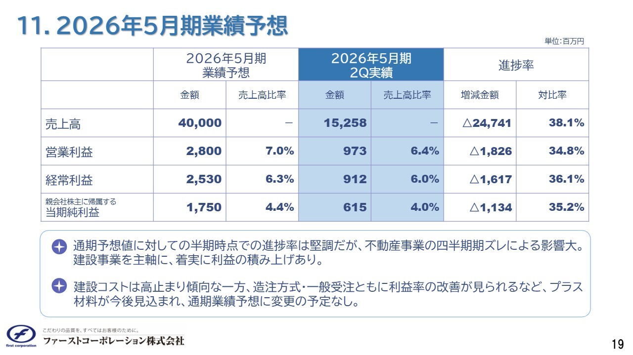 2026年5月期の業績予想に対する進捗についてご説明します。当期の業績予想は、売上高400億円、営業利益28億円です。第2四半期の進捗率は、売上高が38.1パーセント、営業利益が34.8パーセントとなっており、進捗率としてはまだ十分ではありません。しかし、計画に対しては予定どおりと認識しており、年度計画値の変更は予定していません。引き続き当社の業績にご注目ください。