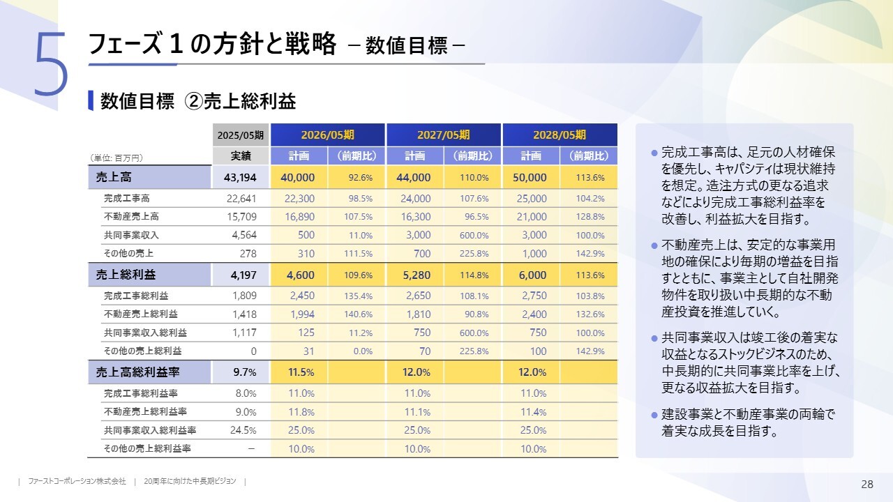 フェーズ1の数値目標です。詳細はスライドをご覧ください。説明は割愛しますが、フェーズ1は足場固めの時期のため、成長率は堅調に設定し、営業利益率は7パーセント程度としています。建設事業と不動産事業の双方の収益構造を維持しながら、成長を拡大していく方針です。