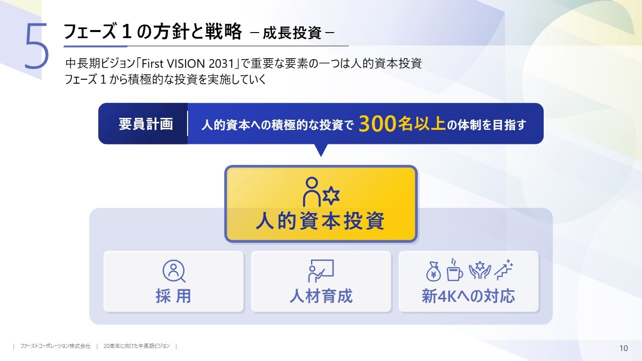 中長期ビジョン「First VISION 2031」では、フェーズ1の重要要素の1つとして人的資本投資を掲げています。売上高1,000億円の達成には300名以上の人員が必要となるため、採用、人材育成、新4Kへの対応を3つの重要施策としています。