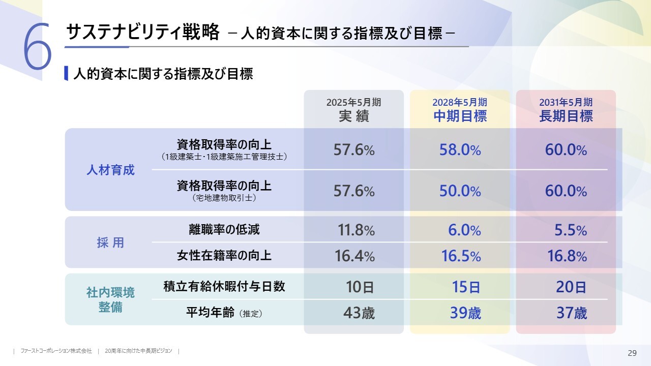 サステナビリティ戦略についてです。人的資本投資を推進し、人材育成と採用を強化します。そのための指標の1つとして、資格取得率の向上を長期的に目指していきます。また、離職率の低減を目指し、社員の定着を図ります。