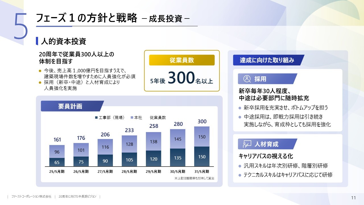 スライドのグラフは、離職率を考慮した人員の想定推移を示しています。建設事業の業容拡大には増員が欠かせません。現場数を増やすため、採用と人材育成を強化し、着実な増員を目指します。本社と現場の両方で増員を予定しており、2031年5月期には従業員数300名を目指します。