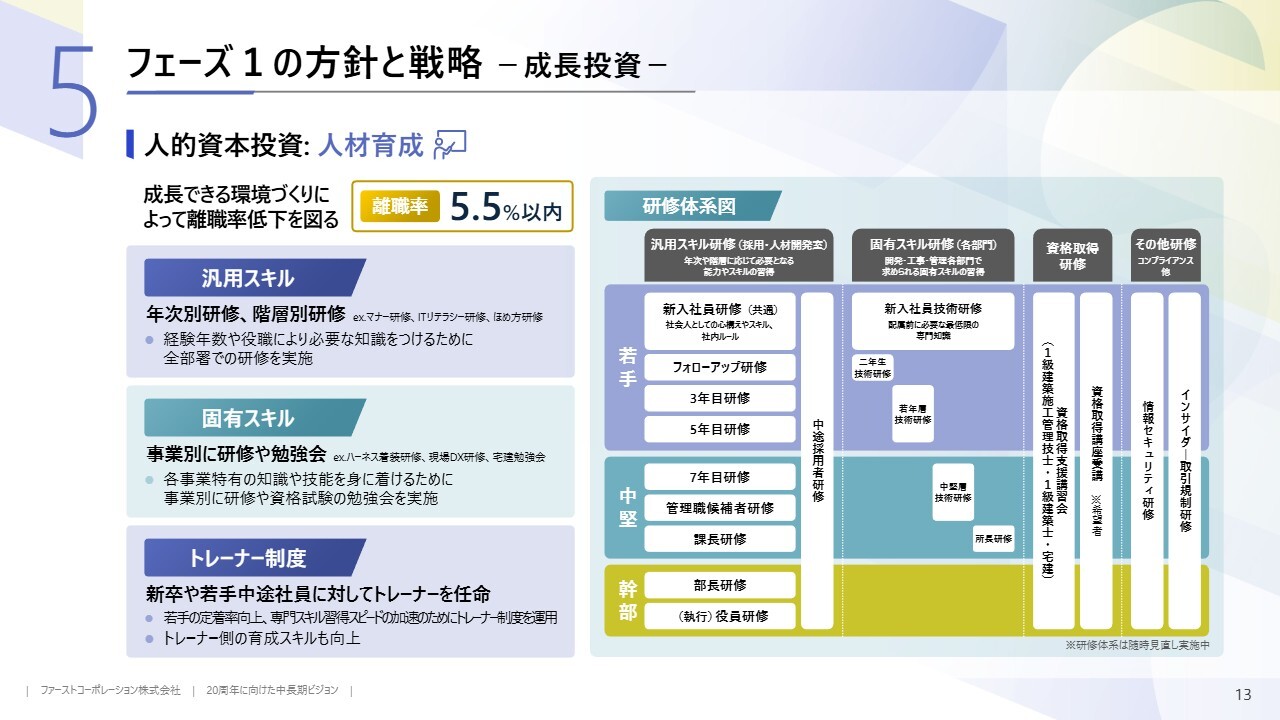 人的資本投資の施策として、離職率を5.5パーセントまで下げることを目標とします。具体的には人材育成を強化し、特に若年層が成長できる環境づくりに注力します。年次や階層に応じた汎用スキルの研修、不動産事業や建設事業など、各事業に必要な固有スキルの研修など、状況に合わせた研修計画を策定し、順次対応していく予定です。