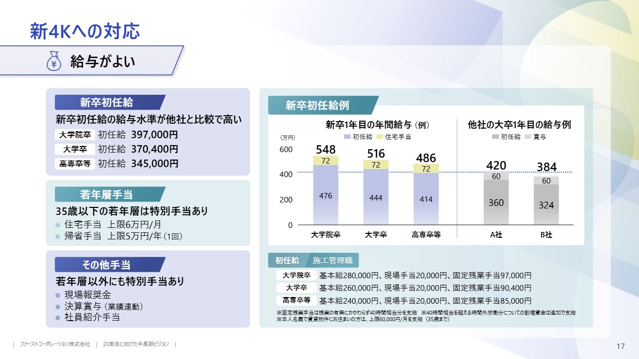 当社の新卒初任給は他社と比較して高く設定しています。スライド右側のグラフをご覧ください。施工管理職の場合、住宅手当を含めると年収は516万円となります。さらに各種諸手当が加わるため、実際の年収実績は516万円以上です。この給与体系は若年層にとって大きな魅力となっています。