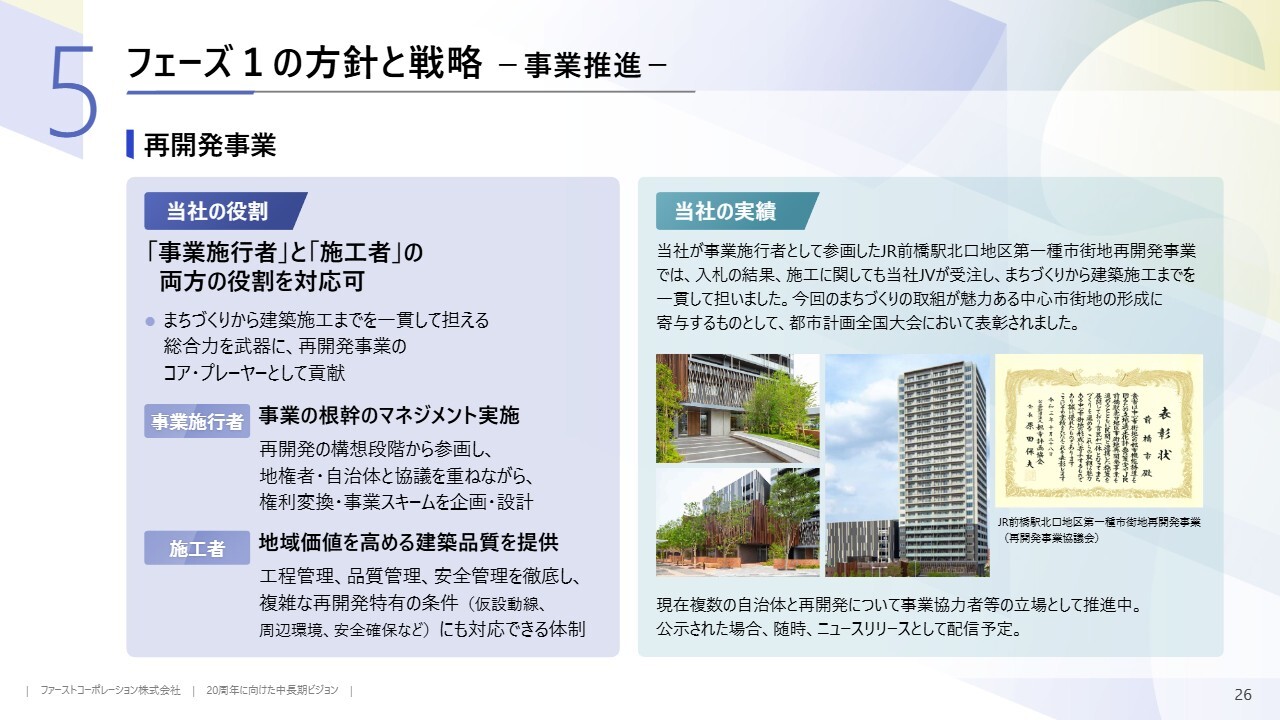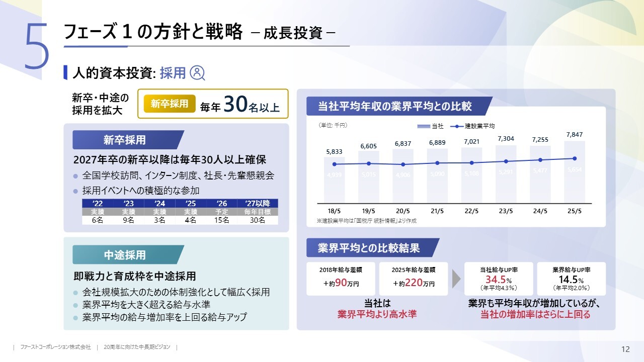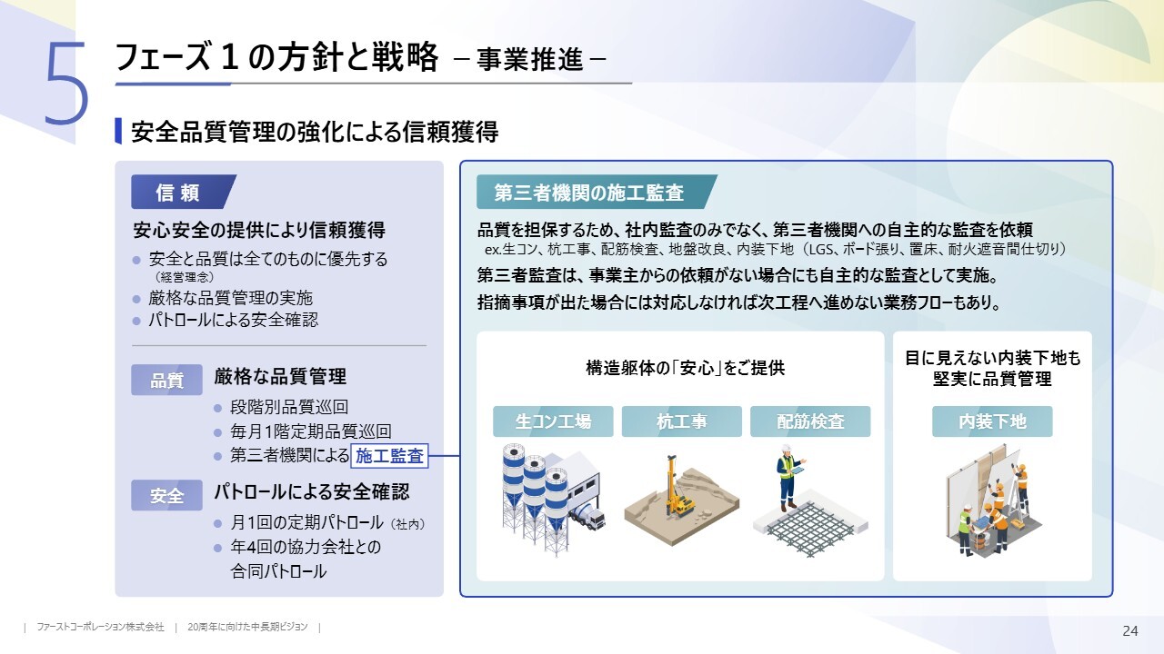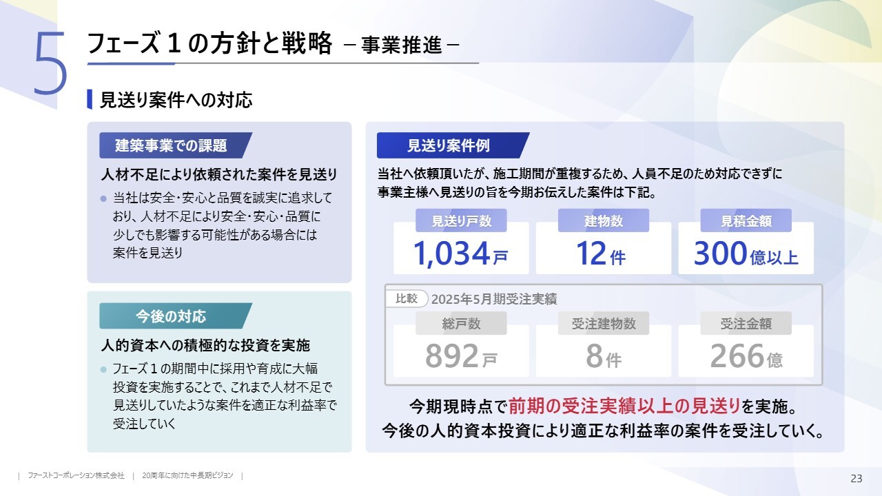 建築事業では人材確保を進め、フェーズ2に向けた受注件数や現場数の増加に備える準備期間としています。一方、不動産事業では安定的な事業用地の確保に加え、自社開発物件を徐々に増やし、賃貸マンションやホテルなど、中長期的な不動産投資を進めていく方針です。