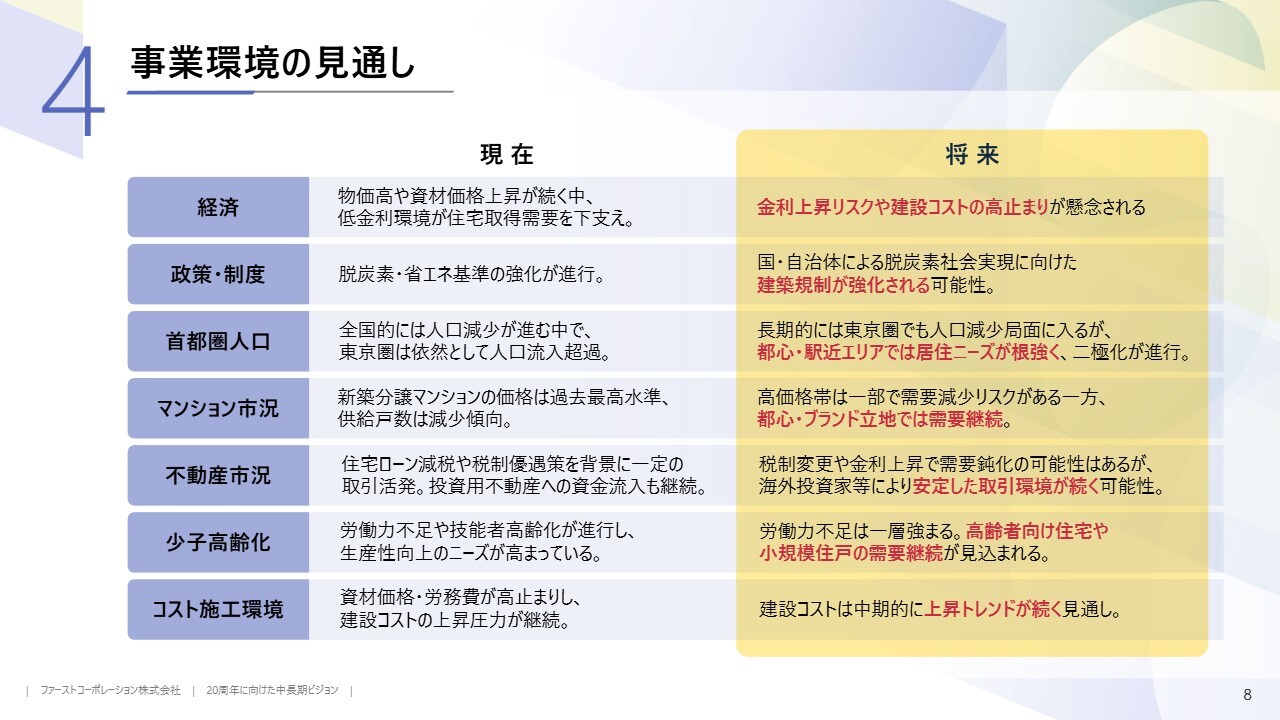 当社が属する事業環境の見通しです。物価高や円安の影響により、建設業の建設コストは高止まりしており、今後も上昇トレンドが続くと予測されます。不動産市況では、都市部の価格高騰が続いています。税制優遇の追い風もあり、少子化の影響下でも居住用不動産の需要は依然として活況です。