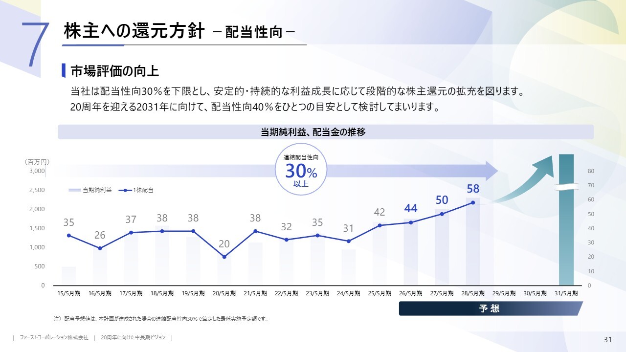 配当についてです。グラフで示しているとおり、当社は配当性向30パーセント以上を掲げ、これまで継続してきました。今後も株主還元は経営上の重要事項の1つであるため、連結配当性向30パーセント以上を下限としつつ、さらなる拡充を目指し、配当性向40パーセントを1つの目安として検討していきます。