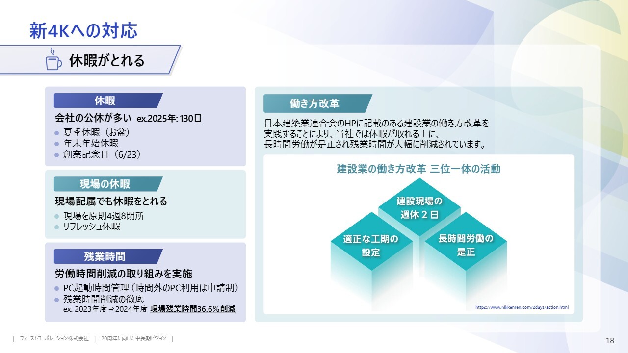 さらに、働き方改革の一環として、当社の現場は原則として4週8閉所を採用しており、他社と比較しても遜色のない休暇日数を実現しています。また、残業時間の削減にも取り組み、2024年には前年比36.6パーセントの削減を達成しました。