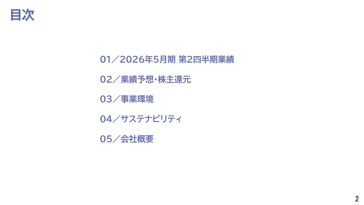本日は、2026年5月期第2四半期の決算概要および中長期ビジョンについてご説明します。決算の詳細は、常務執行役員経営企画室室長兼管理本部経理部長の遠藤よりご説明します。どうぞよろしくお願いします。