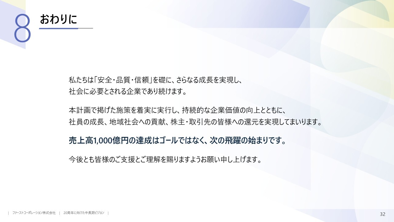 売上高1,000億円の達成はゴールではありません。次の飛躍に向けた新たなスタートだと考えています。今後とも、みなさまのご理解とご支援を賜りますよう、よろしくお願い申し上げます。