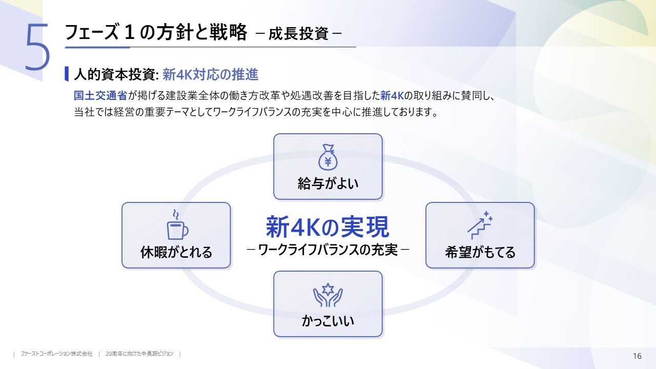 人的資本投資の最後の施策として、新4K対応の推進についてご説明します。新4Kとは、国土交通省が掲げる建設業全体の働き方改革や処遇改善方針であり、当社はその方針に賛同し、ワークライフバランスの充実に向けた独自の取り組みを実施しています。