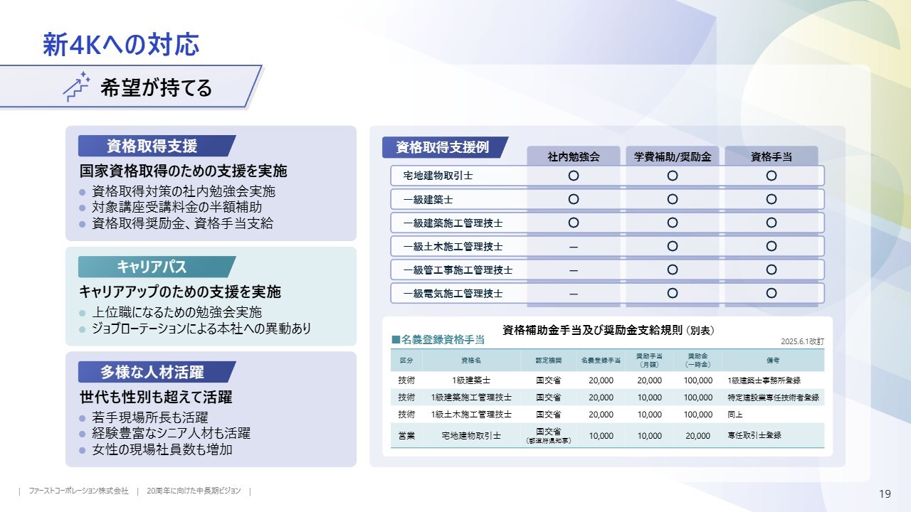 3つ目の「希望がもてる」の具体的な内容についてです。当社では、従業員の資格取得を支援する取り組みを以前から強化しており、若年層に将来性を感じてもらいやすい労働環境を整えています。