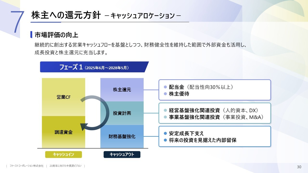 株主還元についてご説明します。フェーズ1では、営業キャッシュフローと外部資金を活用し、人的資本投資とフェーズ2に向けた不動産投資を進めます。また、現在掲げている配当性向30パーセントの株主還元を、さらに最大化できるよう努めます。