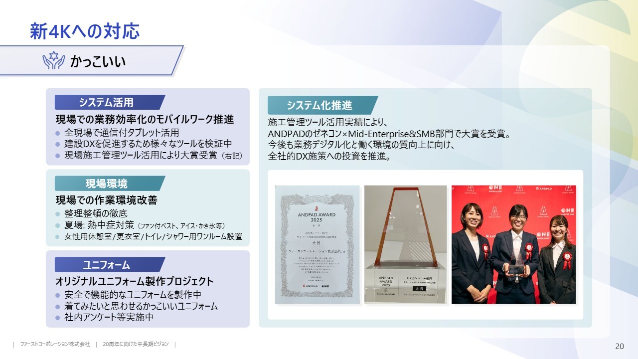 新4Kの4つ目は「かっこいい」です。当社は2024年に発足した建設ディレクターグループを通じて、労働者不足に直面している建設業においてシステム活用とDX化を推進しています。また、現場では整理整頓を徹底し、誰もが働きやすい作業環境を整えています。