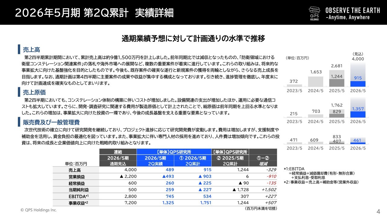 まずは事業進捗についてです。当社子会社のQPS研究所は、開発や調査研究の分野で着実に取り組みを進めています。第2四半期においては、「衛星コンステレーション案件」の落札や海外向けサービス提供体制の拡充を進めるなどの進展がありました。