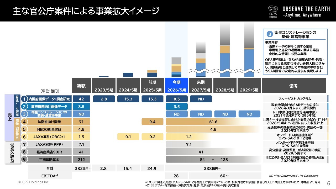 スライドの③衛星コンステレーションの整備・運営等事業について、2025年12月、協力会社6社とともに本件を落札し、2026年2月に契約締結を予定しています。本事業では、各社が持つ専門性を最大限に活かすことが必要であり、最適な参画形態を検討した結果、代表3社によるSPCを設立し、当社の子会社である株式会社QPS研究所を含む4社は技術協力の立場から本事業への貢献を行います。これにより、全参加企業がそれぞれの強みを発揮し、本事業の円滑な推進を支えていくこととなります。