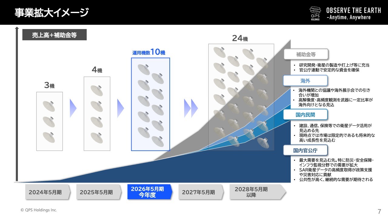 大西:事業拡大のイメージについて大西よりご説明します。衛星の運用機数を増やすとともに、売上拡大を目指す方針です。国内官公庁案件に継続して取り組みつつ、国内民間や海外機関への販売経路の拡大に注力していきたいと考えています。