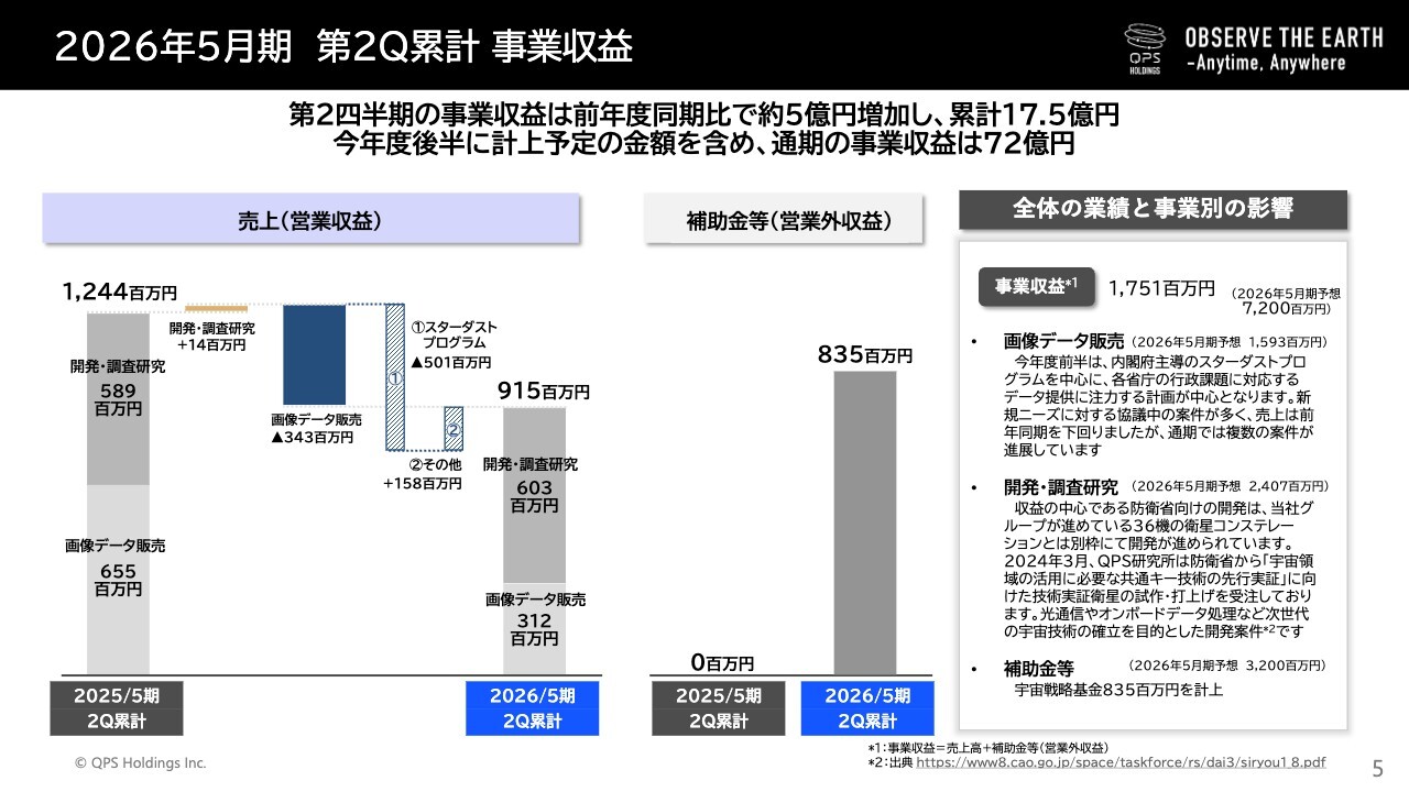 画像データ販売について、今年度は内閣府主導の「スターダストプログラム」を中心に、各省庁の行政課題に対応するデータ提供に注力し、当初想定の進捗を達成していますが、画像データ販売の売上高は前年同期を約3億4,300万円下回る結果となりました。主な売上差異は、2025年5月期のスターダストプログラムによる売上が第2四半期に集中していたためとなります。