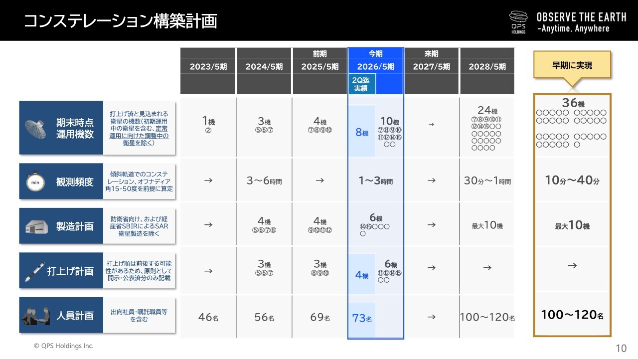A:2028年5月期に24機体制、さらに早期の36機体制の達成を目指し、年間打上げ計画を策定しています。打上げペースの加速化については、製造能力の増強、ロケットの確保、人員体制の強化、費用面の最適化など複数の要素を総合的に判断する必要があります。これらの条件が整うことで、より高頻度の打上げが可能となり、コンステレーションの拡充を加速できると考えています。まずは、計画に基づく打上を着実に実施していくことを最優先としています。