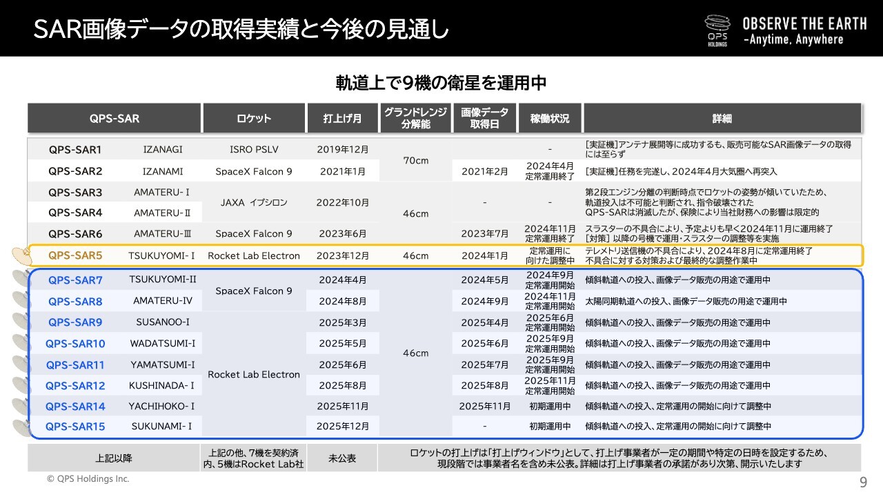 次に衛星の打ち上げと運用状況についてです。今期はQPS-SAR衛星を合計6機打ち上げる予定です。衛星の数を増やすことで、より多くのデータを提供できる体制を整えています。すでに4機の衛星を打ち上げており、2026年1月14日時点の運用状況は、初期運用中2機、定常運用中6機、定常運用に向けた調整中1機の合計9機を運用しています。