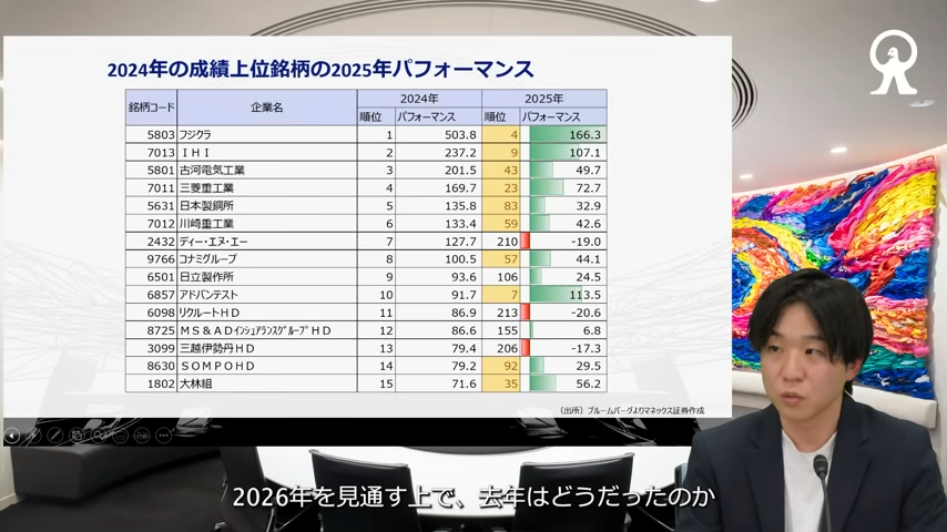 実際、先ほども触れたフジクラは、2024年に1位だったのが2025年には4位となるなど、AI関連や防衛産業といったテーマの銘柄は、翌年も比較的堅調に推移しています。