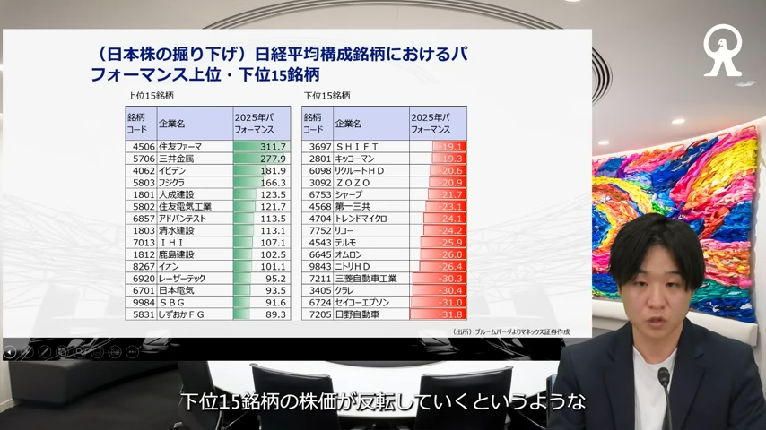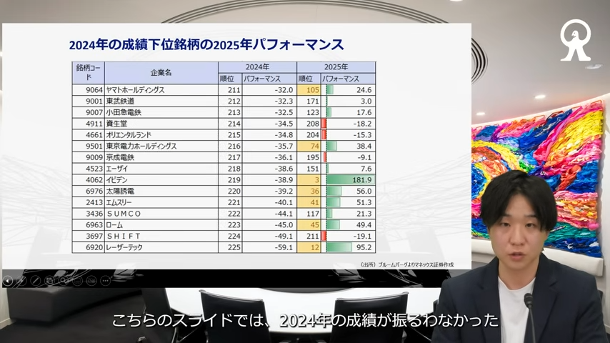 山口:2026年を見通す上で、2024年のパフォーマンス上位銘柄・下位銘柄が、翌年の2025年にどのような順位になったのかを振り返ります。こちらのスライドでは、2024年のパフォーマンス上位15銘柄について、1年後の2025年のパフォーマンスを示しています。