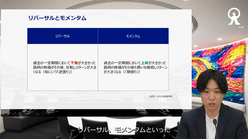 一方で、先ほどのスライドで好調と示されていた銘柄のように、過去一定期間に上昇が大きかった銘柄が、その後も勢いを継続してリターンを拡大していくという、一般的に言う順張りの考え方がモメンタムです。今回は、この2つの概念を理解していただければと思います。