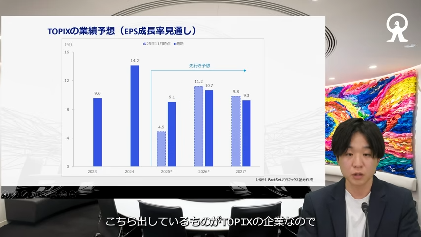 こちらの表は、TOPIXを構成する企業を集計した業績予想(EPS成長率見通し)です。2025年については、まだ業績を開示していない企業もあるため先行き予想も含まれますが、2026年から2027年にかけてもだいたい2桁、9パーセントから10パーセント程度の増益が見込まれています。