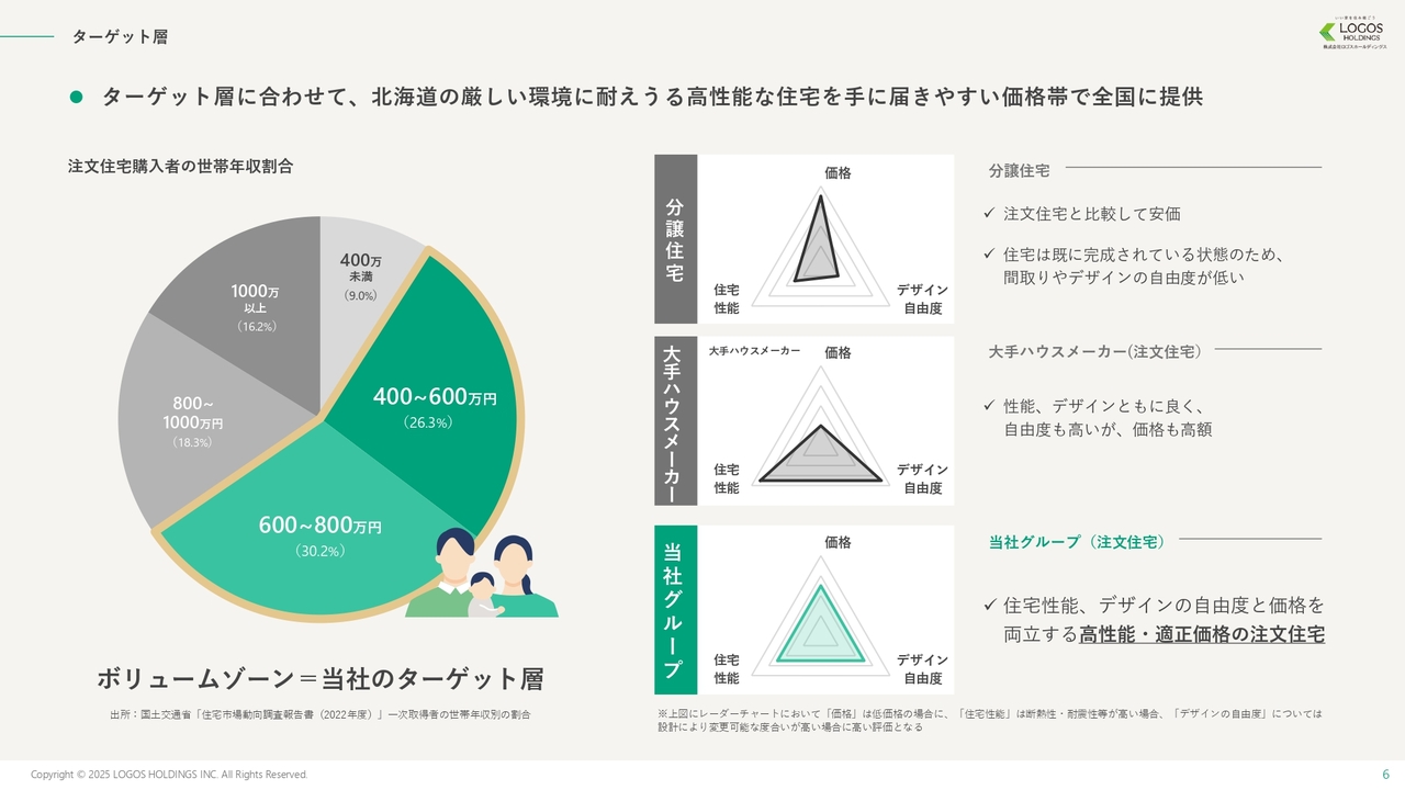 差別化については、お客さまにとって最も重要なのは、性能が良くて価格が安い住宅です。我々の競争優位性として、北海道で培った高性能・高品質な住宅を5パーセント安い価格で提供することで、価格優位性を確立しています。