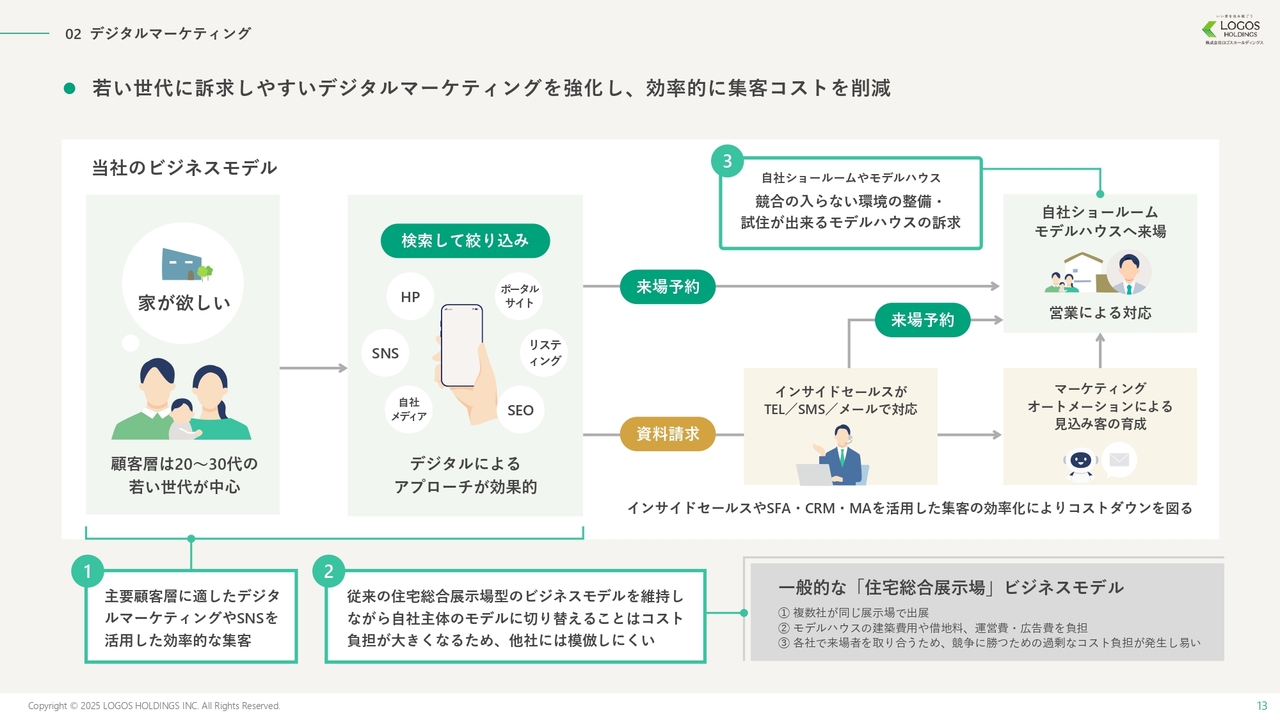 その結果、当社が取り組んでいるデジタルマーケティング、すなわち自社のショールームやモデルハウスにピンポイントで誘導する戦略への切り替えは、投資やその他の問題から容易に実現できず、簡単には模倣できないビジネスモデルであると考えています。