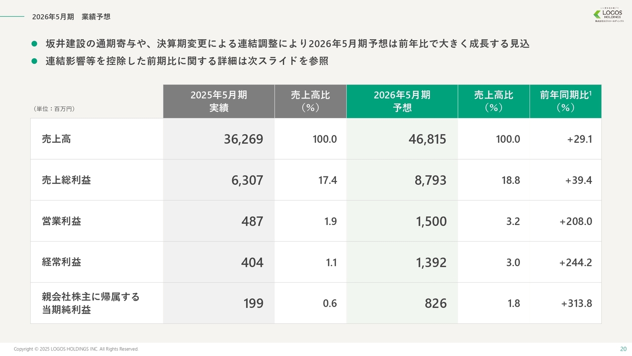 増収増益の要因としては、前期の一過性のM&Aの影響が消えたこと、坂井建設が通期で業績に寄与したこと、さらにロゴスホームで新規出店と既存店のシェア拡大により粗利が増加したことが挙げられます。