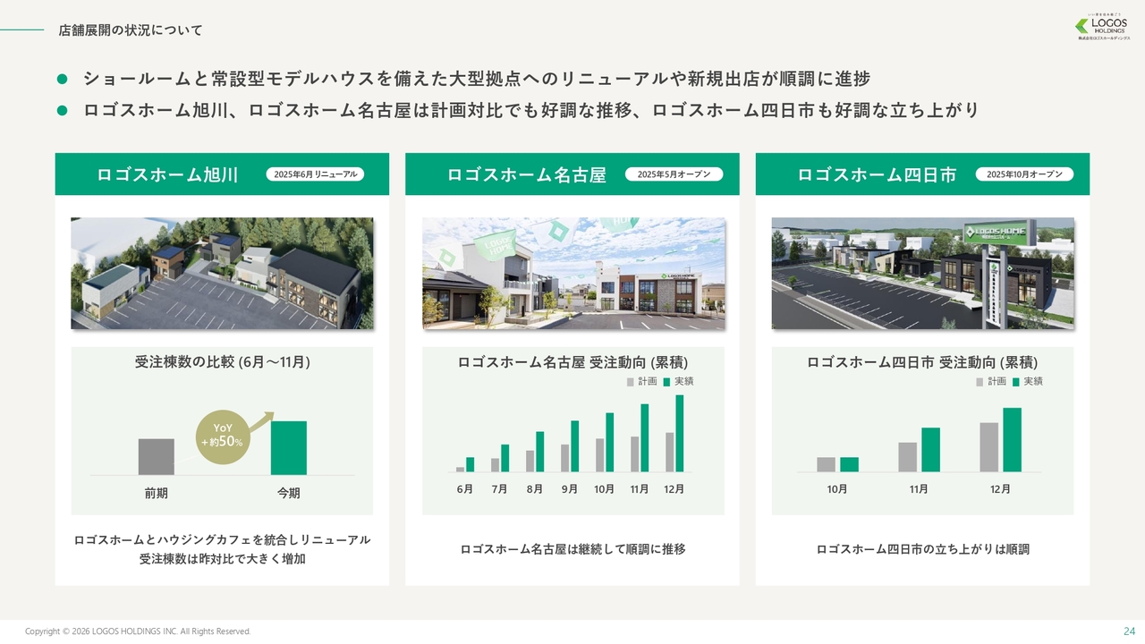 池田:直近の名古屋・四日市拠点については、P/L面では当初の計画どおりに進捗しています。当社のビジネスでは、新規にオープンしてから「集客・商談・受注・着工・引渡」を経て売上となるまで一定程度の時間がかかります。名古屋がオープンし、最初の売上の計上が11月でしたので、これから順次収益化が図れるようになっていきます。