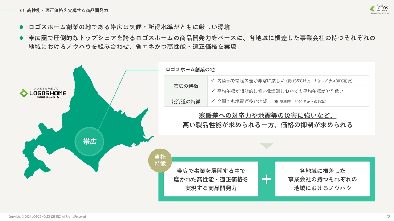 池田:商品開発力についてです。創業の地である北海道帯広市は、冬はマイナス25度、夏はプラス35度と、寒暖の差が年間で約60度に達するという、日本でも非常に厳しい気象条件の地域です。