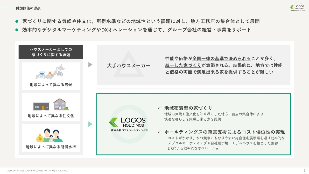 現在、当社はM&Aと自社出店により全国に40拠点を展開しており、今後もさらに拠点を増やす計画です。ただし、当社は単なる住宅会社ではなく、北海道から東海地域にかけて活動する地方工務店の集合体であり、その中核となるのがデジタルマーケティングとDXを活用したビジネスモデルです。